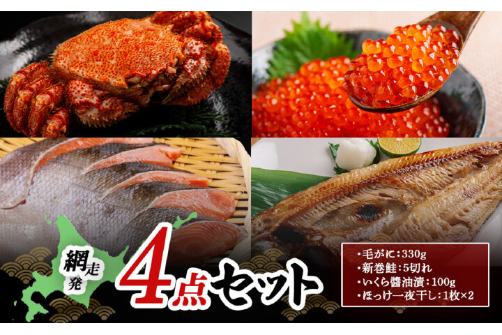 網走発4点セット(毛がに・新巻鮭・いくら醤油漬・ほっけ一夜干し) ABB165