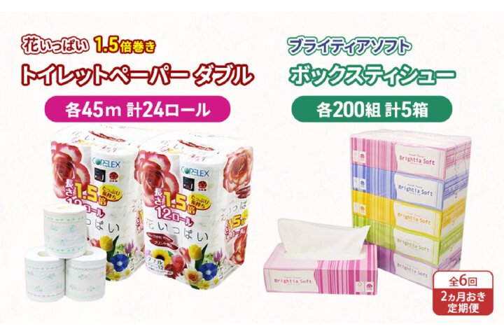 たっぷり長持ち!1.5倍巻き 花いっぱい トイレットペーパー(ダブル)45m 計24ロールとブライティアソフト BOXティッシュ 各200組 計5箱のセットを2ヵ月毎全6回お届けいたします!