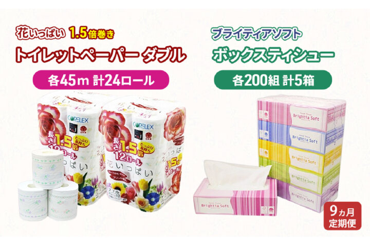 たっぷり長持ち!1.5倍巻き 花いっぱい トイレットペーパー(ダブル)45m 計24ロールとブライティアソフト BOXティッシュ 各200組 計5箱のセットを9ヵ月連続でお届けいたします!