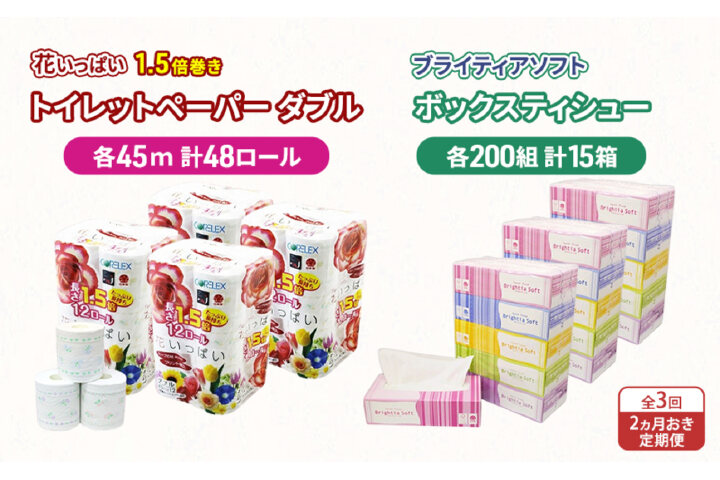 たっぷり長持ち!1.5倍巻き 花いっぱい トイレットペーパー(ダブル)45m 計48ロールとブライティアソフト BOXティッシュ 各200組 計15箱のセットを2ヵ月毎全3回お届けいたします!
