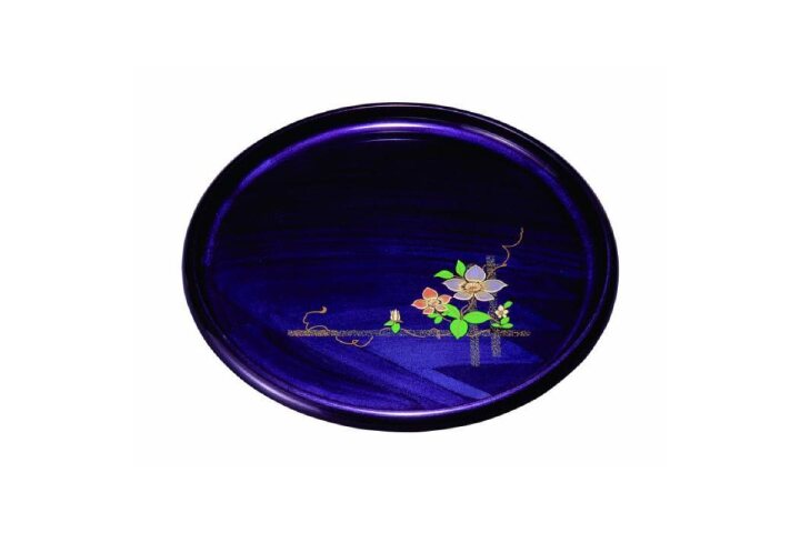 紀州漆器職人が丁寧に仕上げた【丸盆 紫雲杢 鉄線(盛絵) 33cm】です。