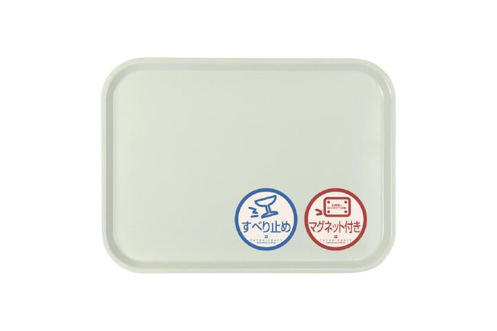 配膳に使ったら水洗いして拭き取り、冷蔵庫やスチール棚の側面に貼って収納できます。置き場所が決まるので、取り出しや片付けがスムーズ。表面はすべり止め加工で食器がずれにくいです。