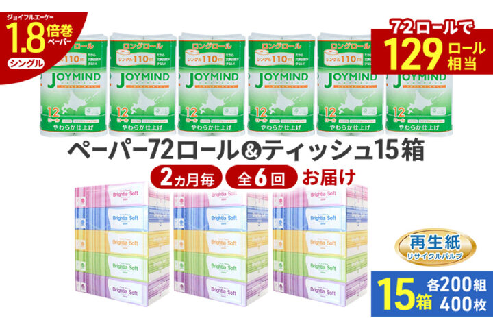 定期便2ヵ月毎 全6回 ティッシュ15箱 トイレットペーパー シングル72ロール 57461976