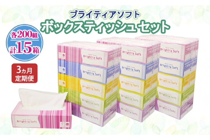 ブライティアソフト BOXティッシュ 各200組 計15箱セットを3ヵ月連続でお届けいたします!