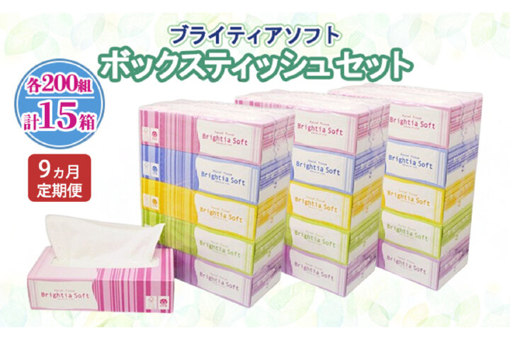 ブライティアソフト BOXティッシュ 各200組 計15箱セットを9ヵ月連続でお届けいたします!
