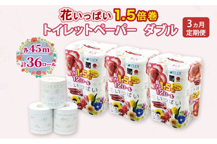 たっぷり長持ち!1.5倍巻き 花いっぱい トイレットペーパー(ダブル)45m 計36ロールセットを3ヵ月連続でお届けいたします!