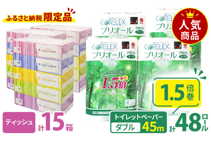 トイレット ペーパー ダブル計48ロール&ソフト ボックスティッシュ15箱 57462038