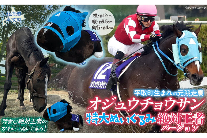 障害レース界の絶対王者「オジュウチョウサン」の存在感たっぷりの特大ぬいぐるみです。