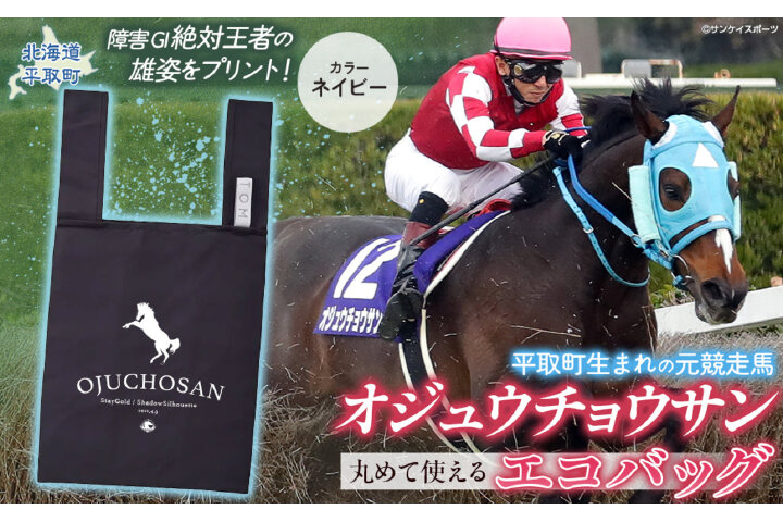 障害レース界の絶対王者「オジュウチョウサン」の放牧地で立つ雄大な姿がデザインされた丸めて使える「クルリト MOTTERU」のエコバッグです。
