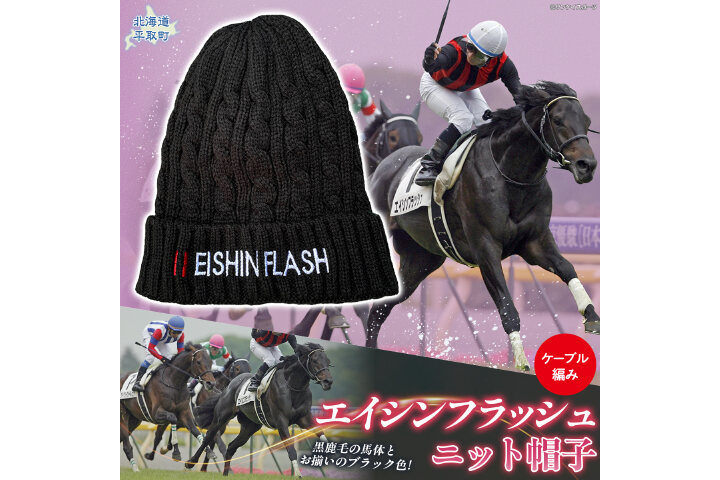ウマ娘でも人気のあるダービー馬「エイシンフラッシュ」の馬名が刺繍されたケーブル編みのデザインニット帽子です。