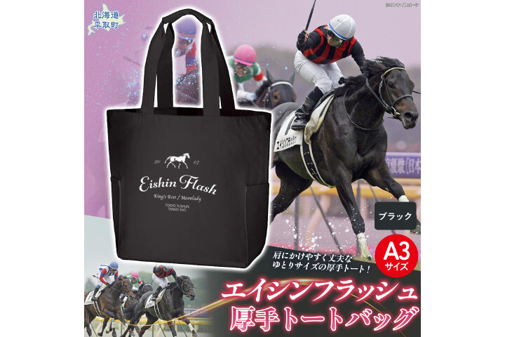ウマ娘でも人気のあるダービー馬「エイシンフラッシュ」の黒鹿毛に似たブラック色の厚手トートバッグです。