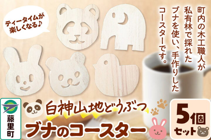 白神山地どうぶつブナのコースター 5個セット くま・パンダ・うさぎ・ぞう・ひよこ(各1…|10274