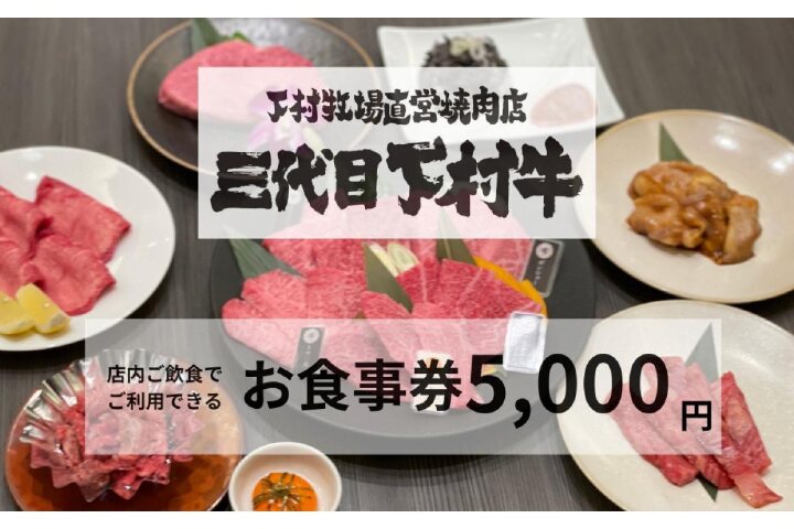 下村牧場直営焼肉店「三代目下村牛」お食事券5,000円分