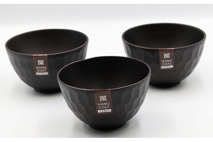 商品:3個 サイズ:φ12×7cm 材質:ナツメ材 塗装:ウレタン塗装(ケイ素ガラスコーティング) 容量:340ml