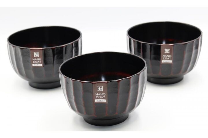 商品:3個 サイズ:φ13×8cm 材質:ナツメ材 塗装:漆塗装(ケイ素ガラスコーティング) 容量:500ml