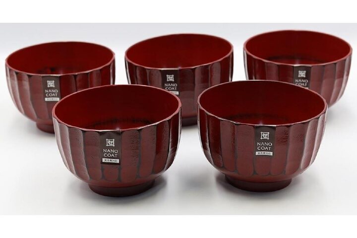 商品:5個 サイズ:φ13×8cm 材質:ナツメ材 塗装:漆塗装(ケイ素ガラスコーティング) 容量:500ml