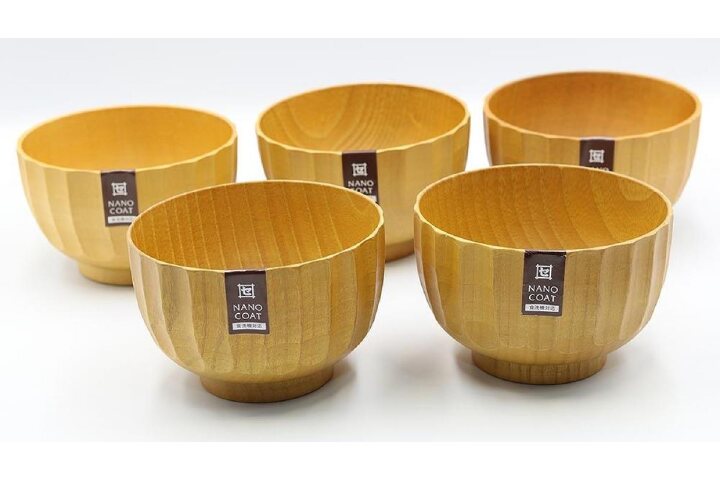 商品:5個 サイズ:φ13×8cm 材質:ナツメ材 塗装:ウレタン塗装(ケイ素ガラスコーティング) 容量:500ml