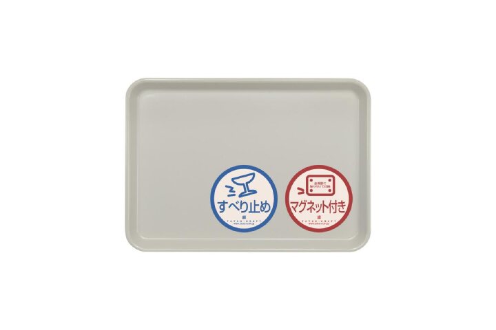 配膳に使ったら水洗いして拭き取り、冷蔵庫やスチール棚の側面に貼って収納できます。置き場所が決まるので、取り出しや片付けがスムーズ。表面はすべり止め加工で食器がずれにくいです。