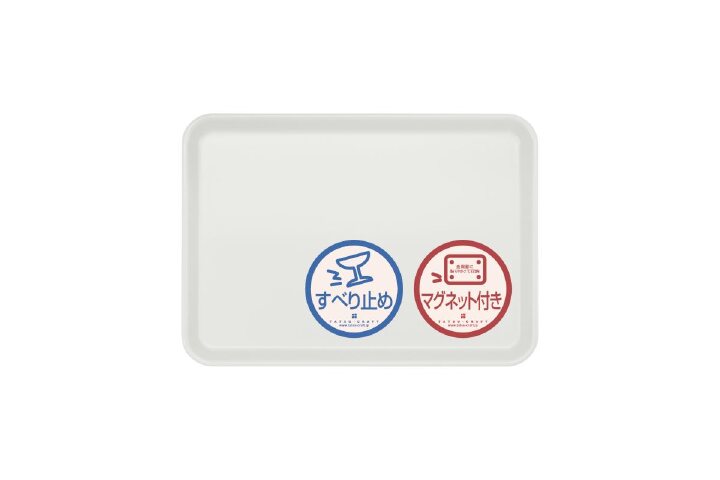 配膳に使ったら水洗いして拭き取り、冷蔵庫やスチール棚の側面に貼って収納できます。置き場所が決まるので、取り出しや片付けがスムーズ。表面はすべり止め加工で食器がずれにくいです。