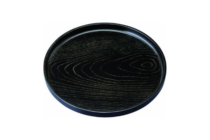 紀州漆器職人が丁寧に仕上げた【丸盆 27cm 金彩 黒ケヤキ杢 ノンスリップ】です。