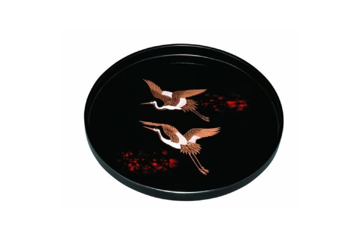 紀州漆器職人が丁寧に仕上げた【丸盆 33cm 別甲 二羽鶴】です。