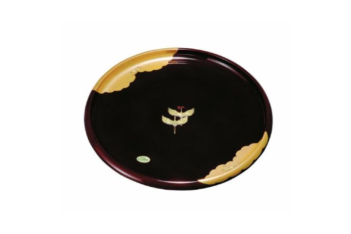 紀州漆器職人が丁寧に仕上げた【紀州塗り 丸盆 金雲昇鶴 溜塗り 24cm】です。