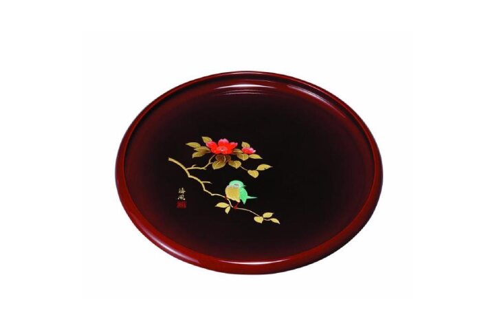 紀州漆器職人が丁寧に仕上げた【丸盆 溜 さえずり 30cm】です。